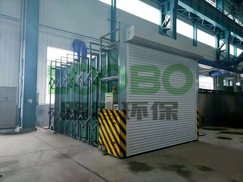 鍛壓廠鍛造壓機火焰切割機橫梁伸縮有效行程5m,升降有效行程3m,其長*寬*高=6.8*6*4.1m,本方案設計使用可滑動房進行煙塵收集,房體長4米,寬4.5米,高4米,可滑動距離10米,配獨立驅(qū)動系統(tǒng),隨切割機一起動作。系統(tǒng)設計風量22000m3/h,采用一臺高效濾筒除塵器,