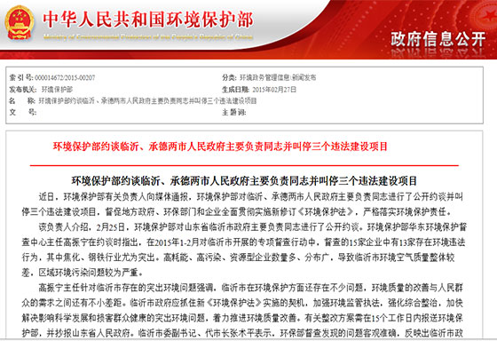 環(huán)保部刊發(fā)約談臨沂市長原文:《環(huán)境保護(hù)部約談臨沂、承德兩市人民政府主要負(fù)責(zé)同志并叫停三個(gè)違法建設(shè)項(xiàng)目》