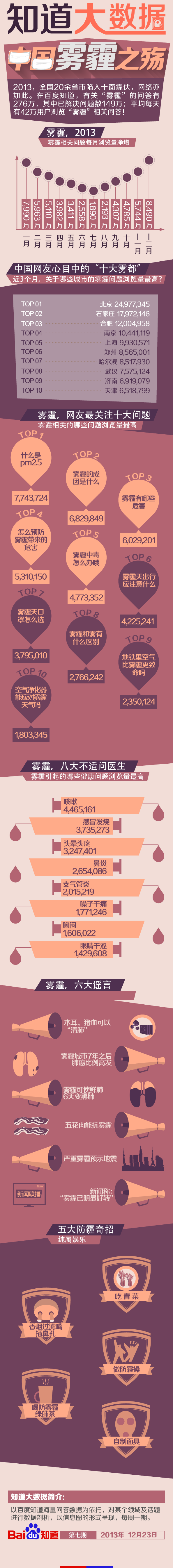 2013,全國(guó)20余省市陷入十面霾伏,“霧霾”成為全民話(huà)題!在百度知道,有關(guān)“霧霾”的問(wèn)答有276萬(wàn),平均每天有42萬(wàn)用戶(hù)瀏覽“霧霾”相關(guān)問(wèn)答!知道大數(shù)據(jù),盤(pán)點(diǎn)中國(guó)網(wǎng)友心目中的“十大霧都”,粉碎霧霾六大流言!對(duì)了,你今天吃青菜了嗎?