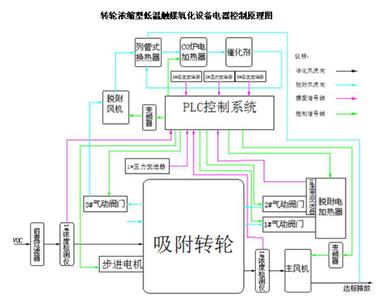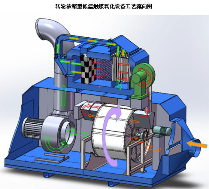 轉(zhuǎn)輪濃縮型低溫觸媒氧化設備:是采用轉(zhuǎn)輪式吸附床對有機廢氣進行吸附濃縮,濃縮的有機廢氣在脫附再生區(qū)被脫附后,被再生風機引入催化燃燒凈化裝置,進一步凈化處理。整個裝置分為VOC濃縮區(qū)和濃縮后VOC凈化處理區(qū)兩大模塊。