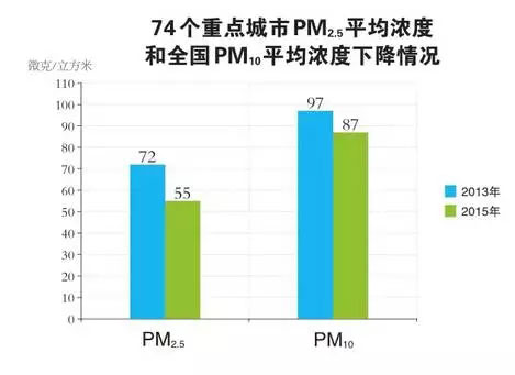 2015年,全國74個重點(diǎn)城市PM2.5平均濃度為55微克/立方米,相對于2013年的72微克/立方米下降23.6%;日均值超標(biāo)天數(shù)的比例由2013年的33.2%降至2015年的20.8%。全國PM10平均濃度(338個城市平均濃度為87微克/立方米),相對2013年(330個城市平均濃度97微克/立方米)下降10.3%;日均值超標(biāo)天數(shù)的比例由2013年的14.5%降至2015年的12.1%。74個重點(diǎn)城市共發(fā)生846天次重度污染和238天次嚴(yán)重污染,較2014和2013年降幅分別為28.1%、24.9%以及49.9%、63.7%。京津冀、長三角、珠三角和成渝地區(qū)NO2濃度相對2013年分別下降9.8%、11.9%、19.5%和15.8%,SO2分別下降44.9%、30.0%、38.1%和48.3%。衛(wèi)星資料反演顯示,2013~2015年,全國NO2和SO2垂直柱濃度年均值和顆粒物光學(xué)厚度(AOD)總體呈下降趨勢,與地面監(jiān)測數(shù)據(jù)分析結(jié)果一致。
