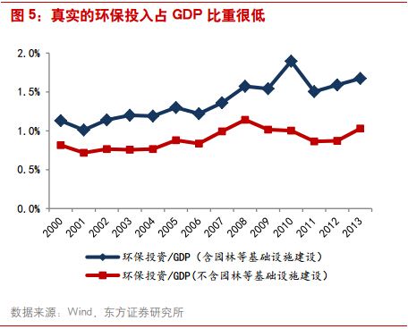 1.高估了的環(huán)保投資,行業(yè)規(guī)模仍較小 對于環(huán)保產(chǎn)業(yè),投資者一直存在一個疑問:官方口徑的投資力度很大,但從企業(yè)端看,規(guī)模卻很小,業(yè)績平淡。本質(zhì)上原因是我們的環(huán)保投入統(tǒng)計(jì)口徑問題,實(shí)際投入確實(shí)很小。按照世界慣例,環(huán)保投入需占當(dāng)?shù)谿DP的2-3%,方能保障環(huán)境污染不再加劇,而之前20多年我們的環(huán)保投入長期保持在1%以下。剔除園林投入后,“十二五”的年環(huán)境治理投入僅在4000-5000億元。