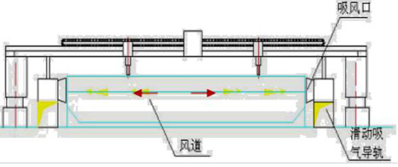 在切割平臺(tái)兩側(cè)安裝方形吸風(fēng)道,吸風(fēng)道上方裝有一個(gè)可隨切割機(jī)一起移動(dòng)的滑動(dòng)吸風(fēng)小車(每個(gè)切割機(jī)兩個(gè))。滑動(dòng)吸風(fēng)小車、切割頭、安裝在切割機(jī)沿橫梁方向的同一直線上。利用切割平臺(tái)上的格柵板與被切割鋼板形成煙氣通道,切割鋼板時(shí),產(chǎn)生的切割煙塵通過該煙氣通道由風(fēng)機(jī)負(fù)壓作用流向滑動(dòng)小車吸風(fēng)口,進(jìn)入方形吸風(fēng)道,最后進(jìn)入凈化器主機(jī)進(jìn)行切割煙塵凈化處理。
